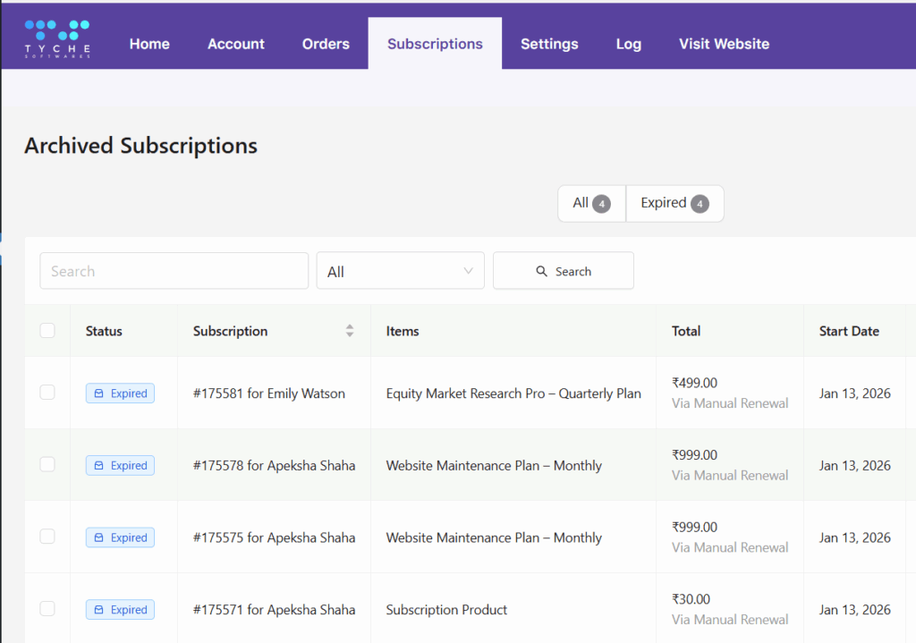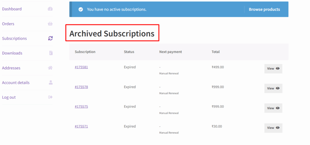 A new Archived Subscriptions section is added to My Account → Subscriptions. Customers can view archived subscription details without affecting active subscriptions.