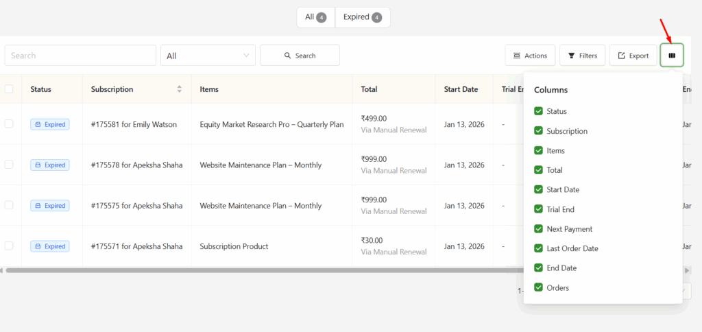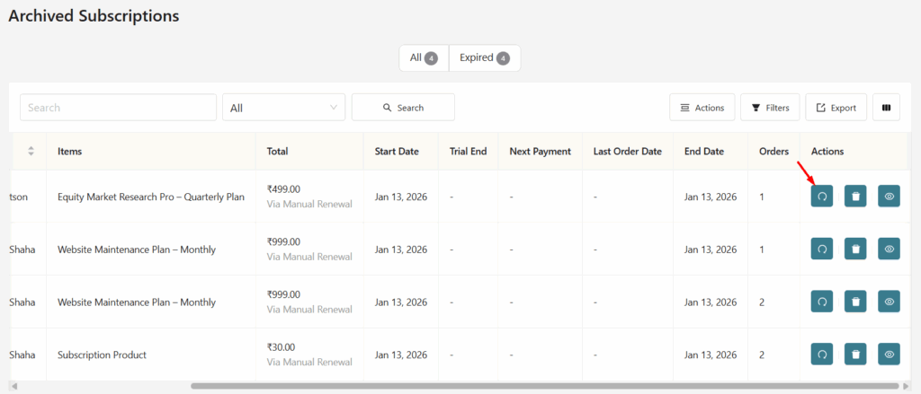 - The subscription becomes available again in the WooCommerce Subscriptions list.