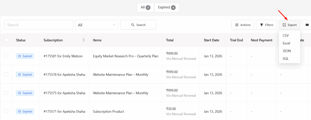 Click Export to download archived subscription data in CSV, Excel, JSON, or SQL formats.