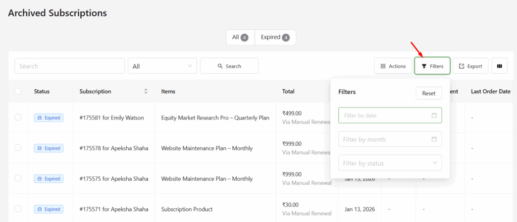 Click the Filters button to apply advanced filtering by start date, month, or subscription status.