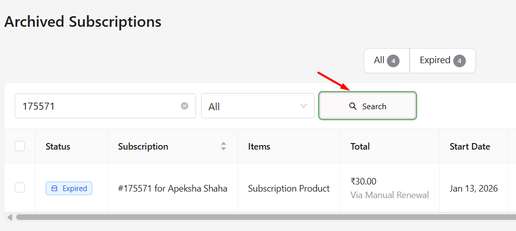 Use the Search bar to find archived subscriptions by subscription ID, customer email, customer name, or subscribed products.