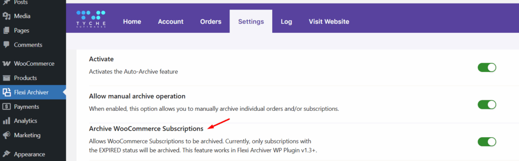 Enable the Archive WooCommerce Subscriptions option to allow Flexi Archiver to archive subscription orders.